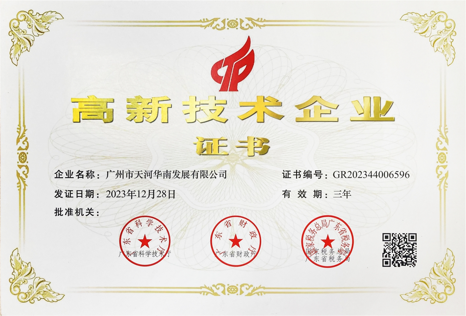 广州市天河华南发展有限公司已获得国家认证高新技术企业称号