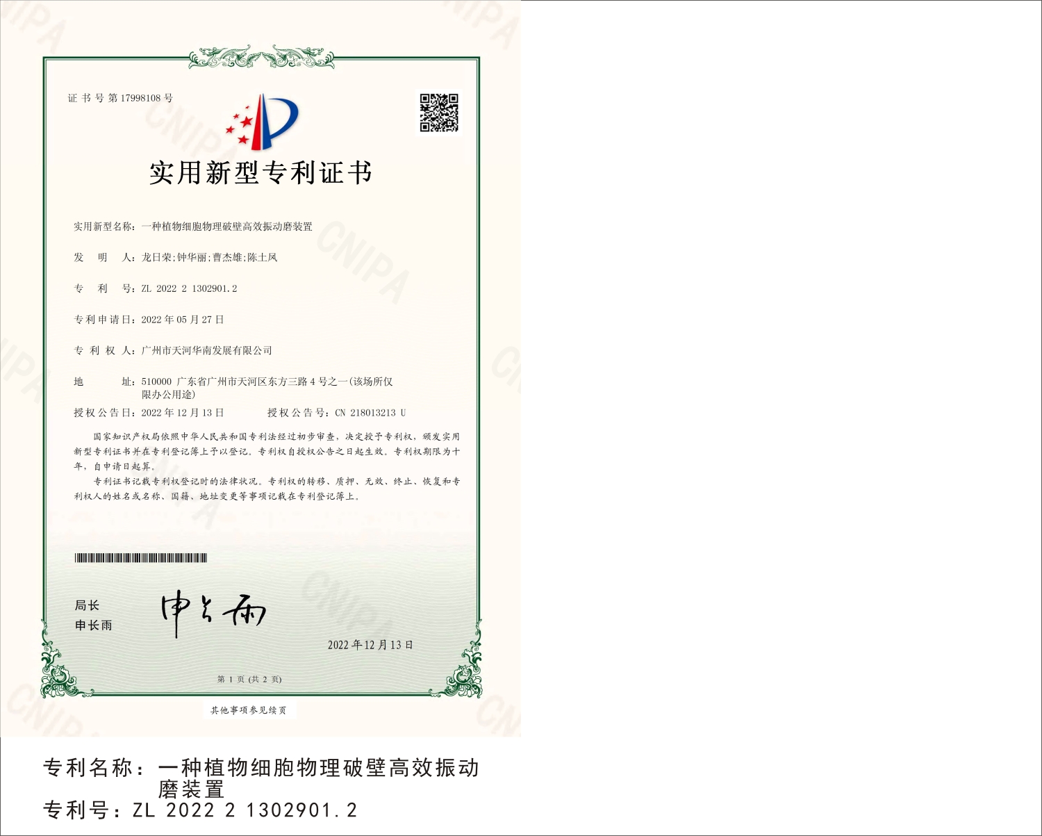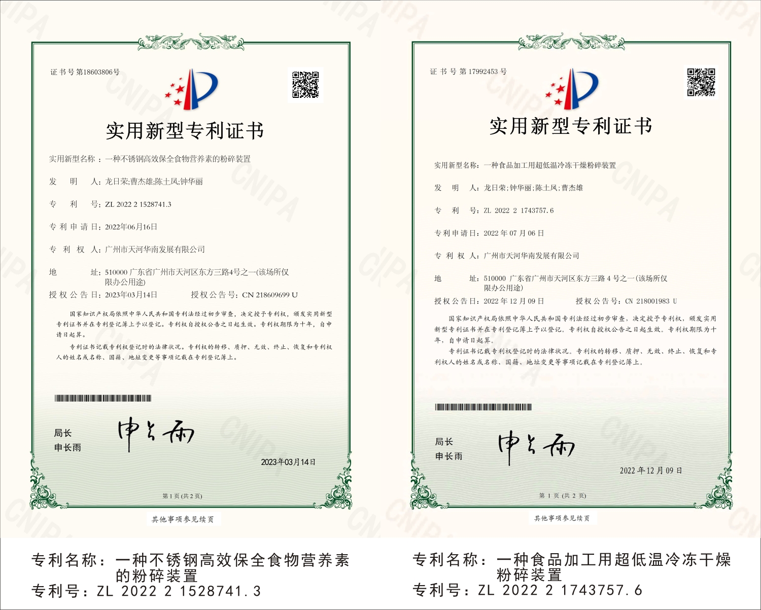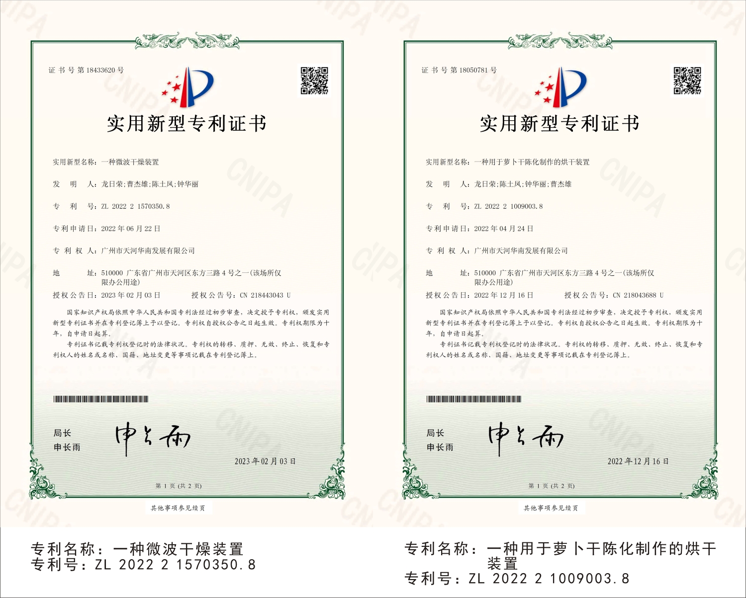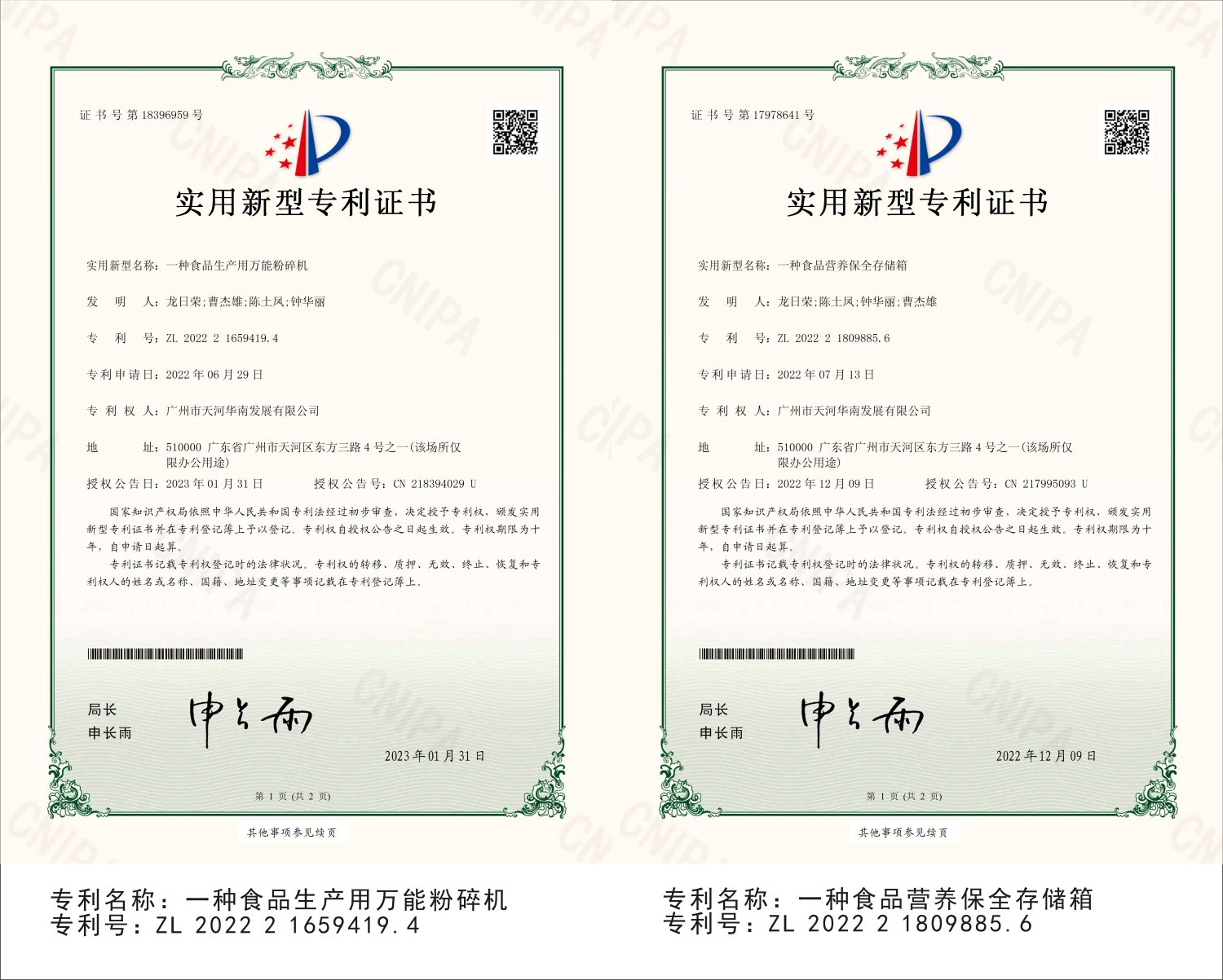 广州市天河华南发展有限公司专利证书展示