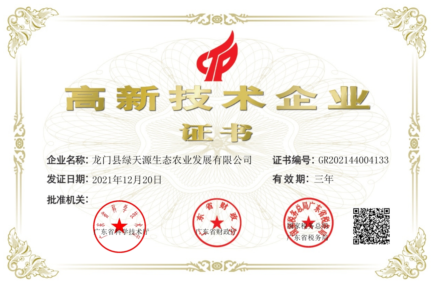 龙门县绿天源生态农业发展有限公司已获得国家认证高新技术企业称号