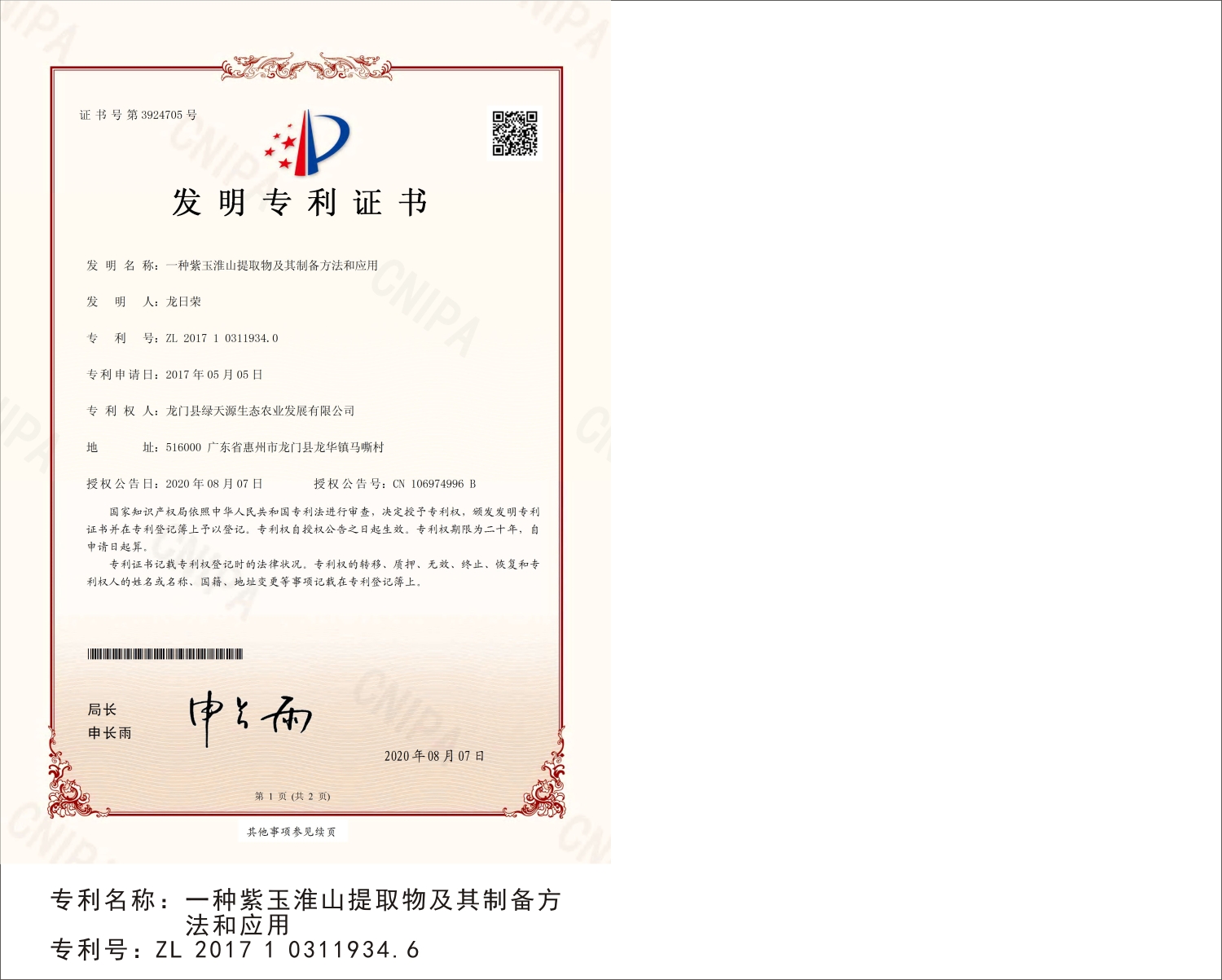 龙门县绿天源生态农业发展有限公司专利证书展示