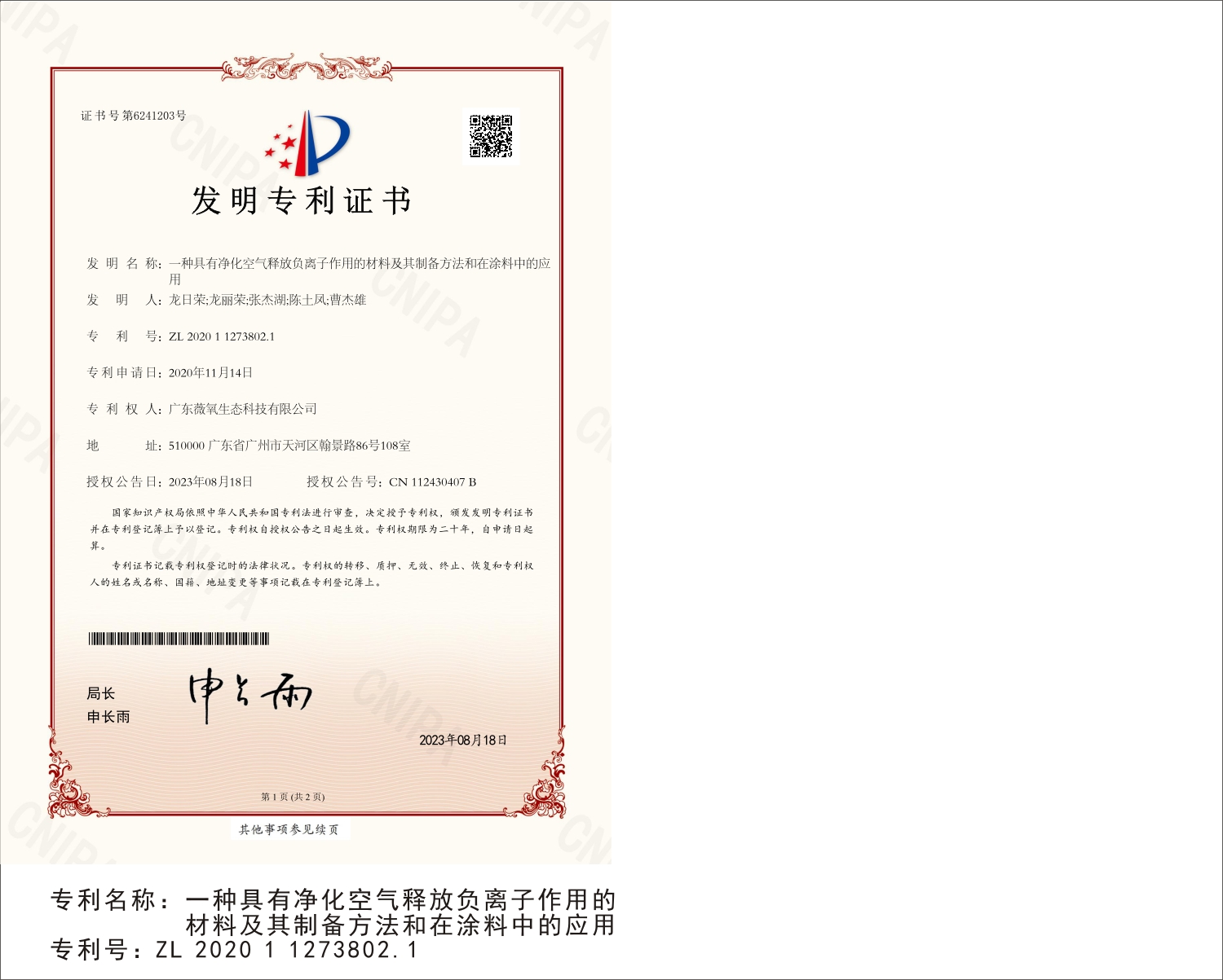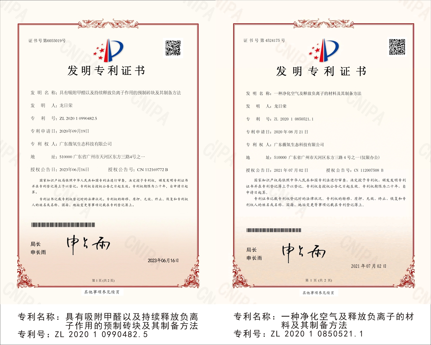广东薇氧生态科技有限公司专利证书展示
